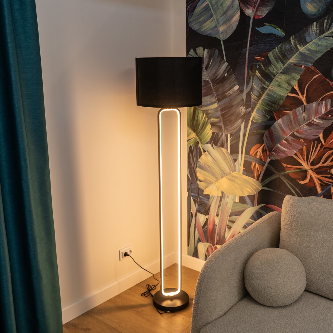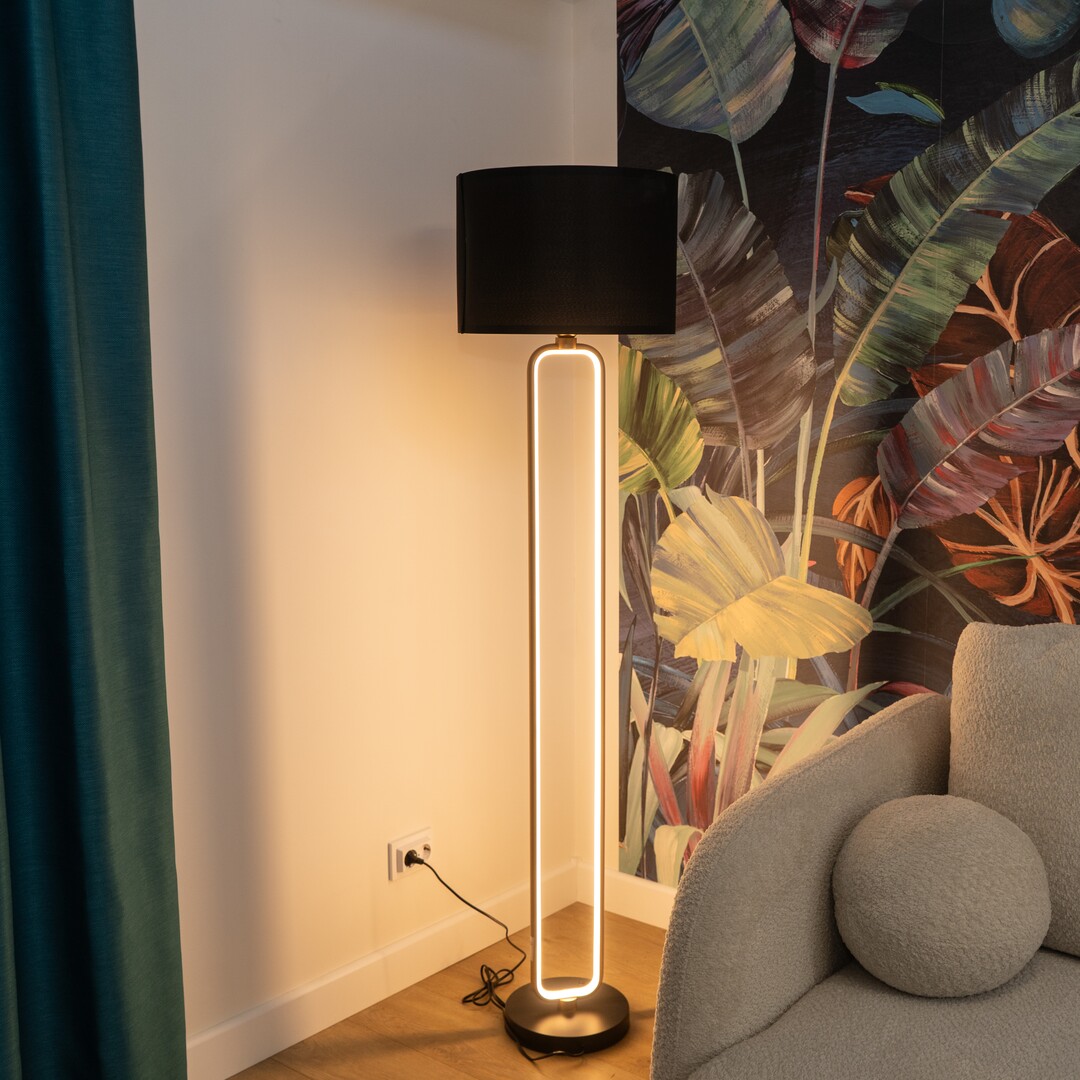Rábalux Domiro podna lampa preporučuje se onima koji žele spojiti energetsku učinkovitost s modernim i elegantnim dizajnom. Ovaj model izrađen je s metalnim držačem zlatne boje i crnim cilindričnim tekstilnim sjenilom, dok stabilnost osigurava okrugla crna ukrasna podloga. Podna lampa upravlja se prekidačem i ima ugrađeni LED izvor svjetlosti, koji na kreativan način emitira svoju toplu bijelu svjetlost unutar okvira koji čini ruku lampe. To se može dopuniti žaruljom snage do 60 W koja se može smjestiti u utičnicu pokrivenu sjenilom. Tip utičnice je E27. Ovaj jedinstveni model idealan je za dnevnu sobu ili spavaću sobu. Zbog LED tehnologije, odlikuje se energetski učinkovitim radom i dugim vijekom trajanja. Lampa dolazi bez izvora svjetlosti.