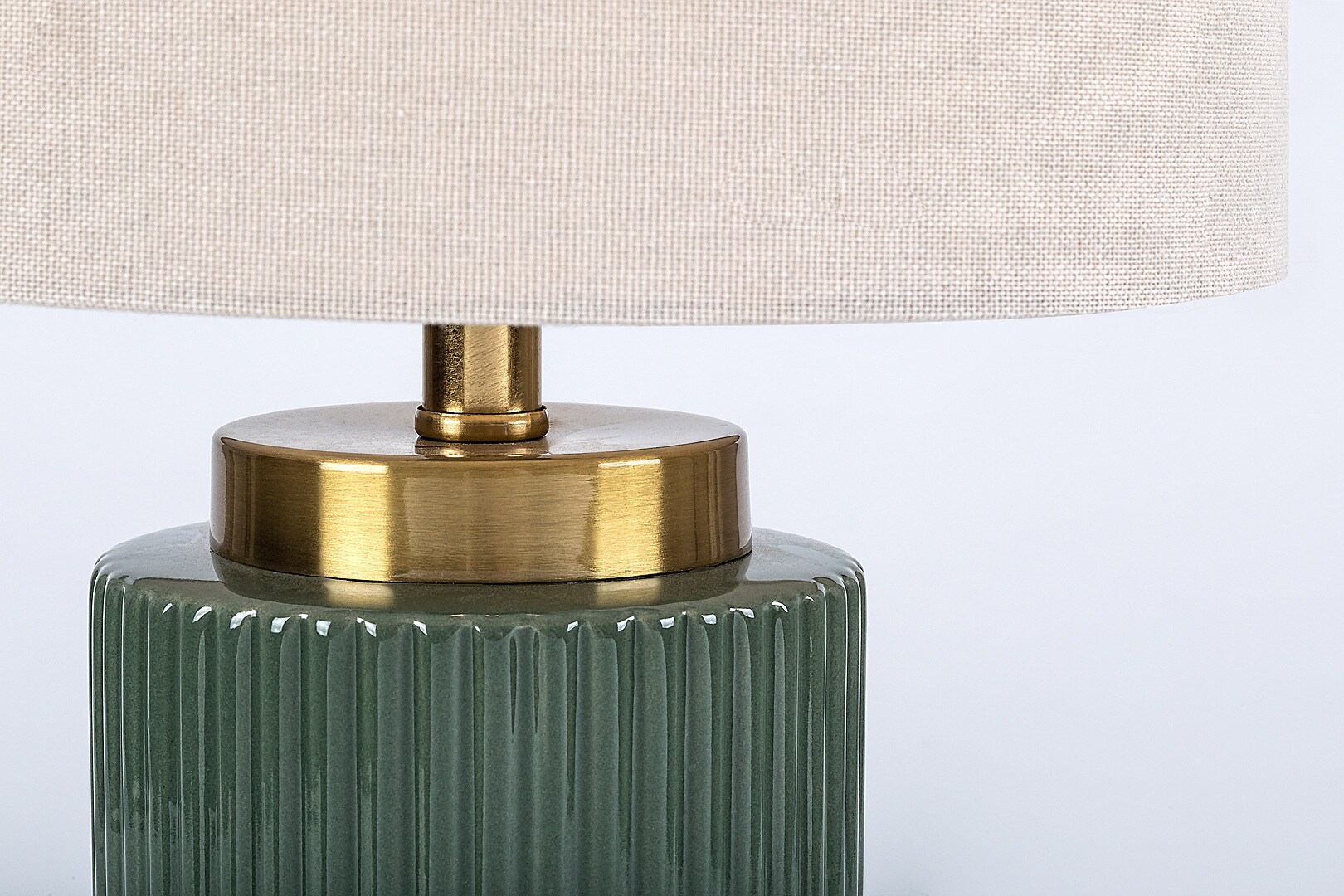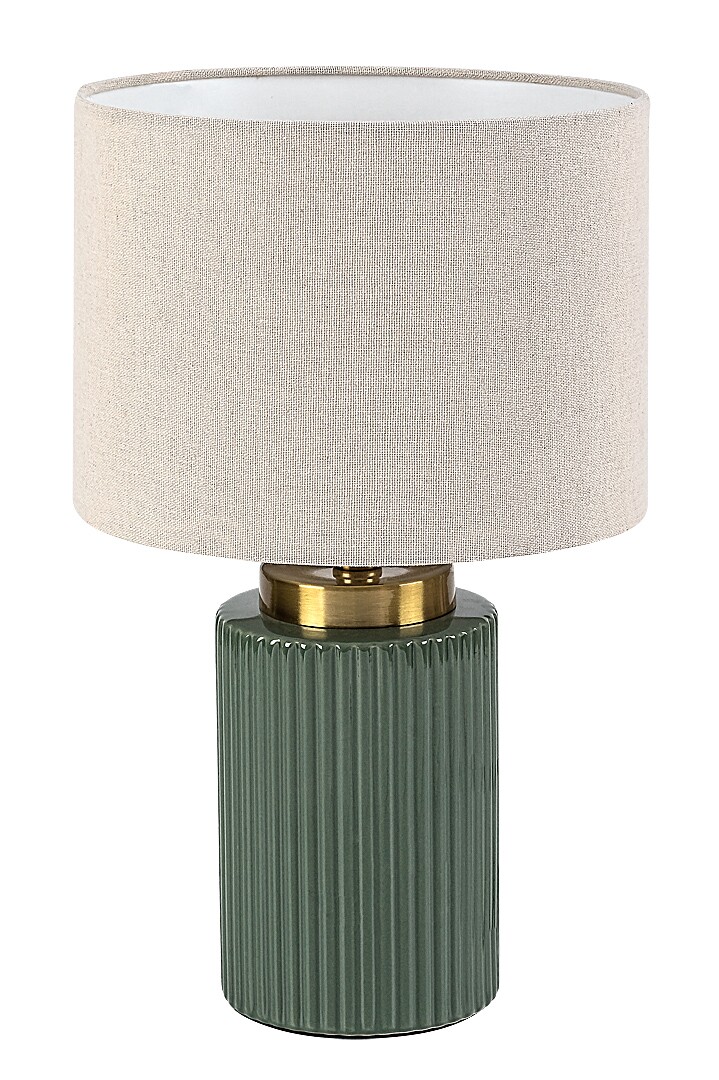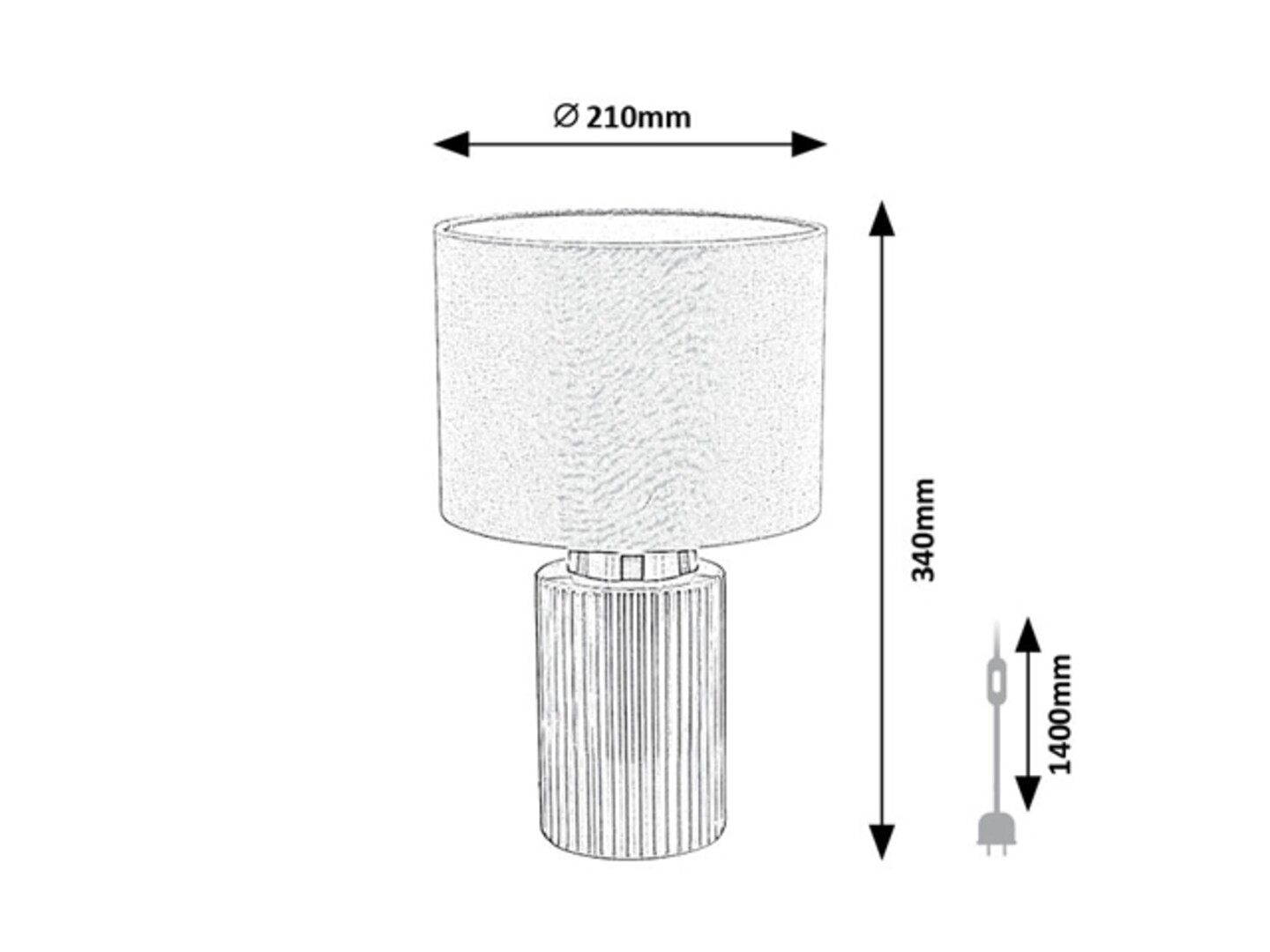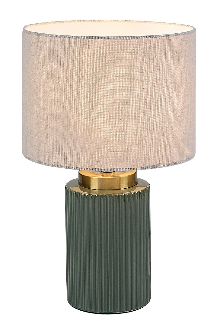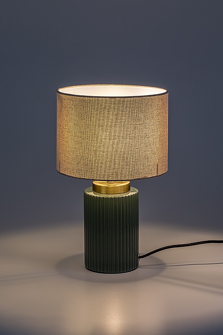 Rabalux Glovy stolna svjetiljka preporučuje se onima koji traže pažljivo dizajniranu dopunsku svjetiljku za spavaću sobu ili dnevni boravak. Zahvaljujući suzdržanim bojama, ovaj se model lako uklapa u različite stilove interijera. Možete je postaviti na noćni ormarić ili stol. Postolje svjetiljke izrađeno je od zelene keramike s rebrastim uzorkom, dok je sjenilo izrađeno od bijelog tekstila. Sjenilo je cilindričnog oblika, otvoreno na vrhu i na dnu. Zahvaljujući svijetloj boji, ovaj model propušta puno svjetla, pa se može koristiti i kao svjetiljka za čitanje. Radi s jednom žaruljom snage do 40 W. Vrsta grla: E14. Noćna svjetiljka nadopunjena je crnim tekstilnim kabelom i prekidačem na kabelu. Isporučuje se bez izvora svjetla.