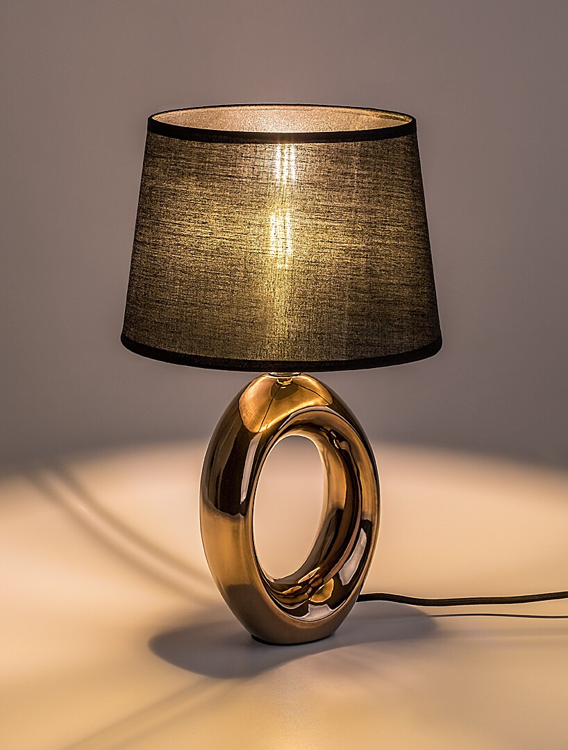 Rabalux Dalora stolna svjetiljka preporučuje se onima koji vole moderne svjetiljke jedinstvenog dizajna. Ovaj upečatljiv model može se postaviti u spavaću sobu ili dnevni boravak. Ima ovalno postolje s otvorom u sredini, izrađeno od keramike u brončanoj boji. Sjenilo je crno, cilindrično, lagano prošireno prema dolje, izrađeno od tekstila. Svjetiljka radi s jednom žaruljom snage do 25 W. Vrsta grla: E14. Možete odabrati izvor svjetla koji emitira toplo ili prirodno bijelo svjetlo. Zahvaljujući tamnom sjenilu, svjetiljka omogućuje diskretnu rasvjetu, što je čini savršenim izborom ako ne želite ometati partnera jakim svjetlom tijekom noći. Noćna svjetiljka ima crni tekstilni kabel i prekidač na kabelu. Isporučuje se bez izvora svjetla.