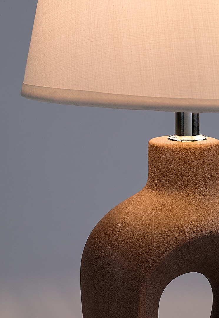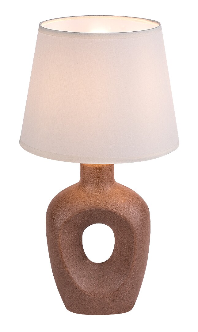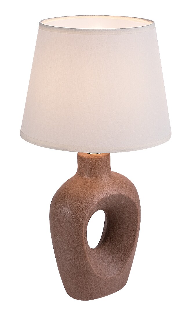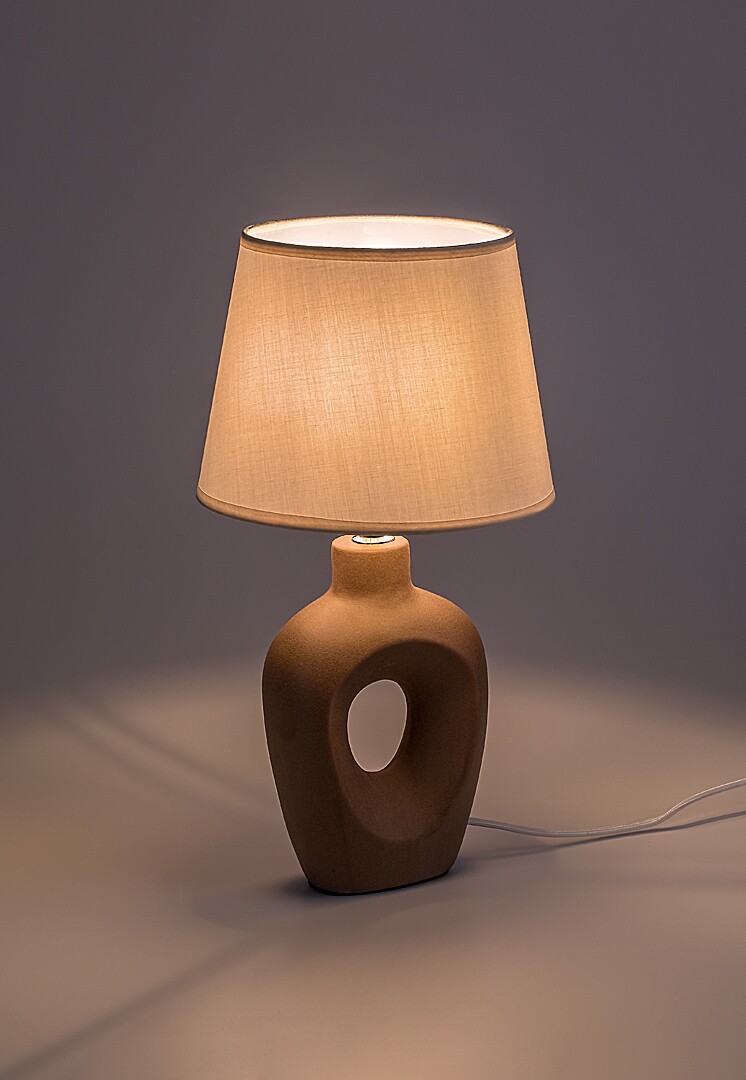 Rabalux Madelor stolna svjetiljka preporučuje se onima koji traže modernu dopunsku svjetiljku jedinstvenog dizajna za dnevni boravak ili spavaću sobu. Noćna svjetiljka izrađena je od smeđe keramike i privlači pažnju svojim karakterističnim oblikom s otvorom u sredini. Sjenilo je u obliku slova A, lagano se širi prema dolje i izrađeno je od bež tekstila koji se slaže s postoljem. Stolna svjetiljka koristi jednu žarulju snage do 25 W. Vrsta grla: E14. Ako se svjetiljka postavi u spavaću sobu, preporučuje se korištenje žarulje koja emitira toplo bijelo svjetlo kako bi se potaknuo opuštajući ugođaj. Može se postaviti na noćni ormarić ili bilo koji stol. Noćna svjetiljka opremljena je bijelim tekstilnim kabelom i kabelskim prekidačem. Isporučuje se bez izvora svjetla.