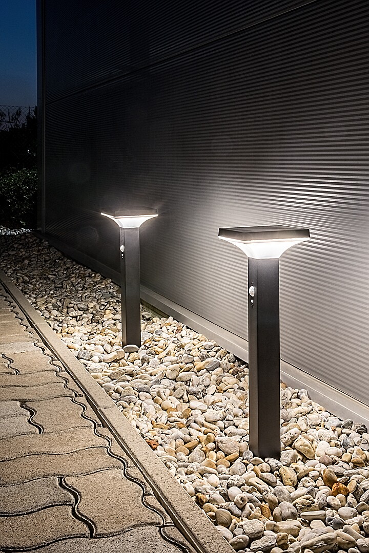 Sa svoja 4 načina rada, moderna Geleen solarna vanjska stojeća svjetiljka sa senzorom pokreta odličan je izbor za terasu ili vrt. Ovaj crni model izrađen je od nehrđajućeg čelika i ima bijeli plastični abažur. Geleen je nadopunjen malim četvrtastim ukrasnim postoljem i glavom svjetiljke u obliku lijevka koja se širi prema gore. Svjetiljka ima ugrađeni LED izvor svjetla snage 4W, svjetlosnog toka 400 lumena sa sjenilom i 600 lumena bez sjenila, te životni vijek 10000 sati. Žarulja emitira toplo bijelo svjetlo, a temperatura boje joj je 3000 K. Širina ove solarne svjetiljke je 145 mm, visina 500 mm, ugradbeni promjer 80 mm. Senzor pokreta detektira kretanje s udaljenosti od 6 do 8 metara pri kutu gledanja od 110°. Baterija je napona 3,7 V i kapaciteta 2.200 mAh. Vrijeme punjenja je 3 do 4 sata, radno vrijeme je 10 do 12 sati. Zaštita svjetiljke IP44 osigurava da je zaštićena od prodora krutih čestica promjera 1 mm ili više i od prskanja vode iz bilo kojeg smjera. Njegov idealan raspon radne temperature je od -20°C do 40°C.